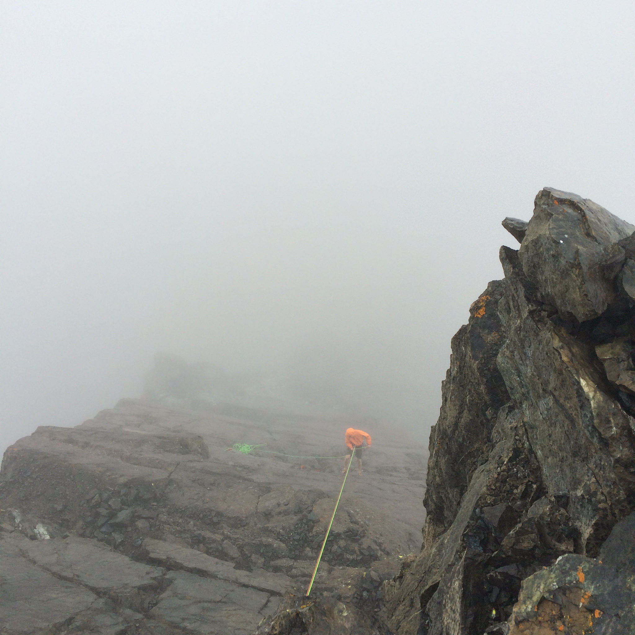 The second pitch was a short one to the base of the final slab, which has a beautiful, easy crack up the middle. Well, it was actually nasty and wet and felt pretty hard, but in our sunny imaginations the rock was great and the climbing easy. On top we took in the clouds for about 2 minutes, snapped some photos, and got out of there. Two double rope rappels got us down. A couple nips of whiskey and an hour and a half of hiking got us to the car, right in time for the sun to start shining.