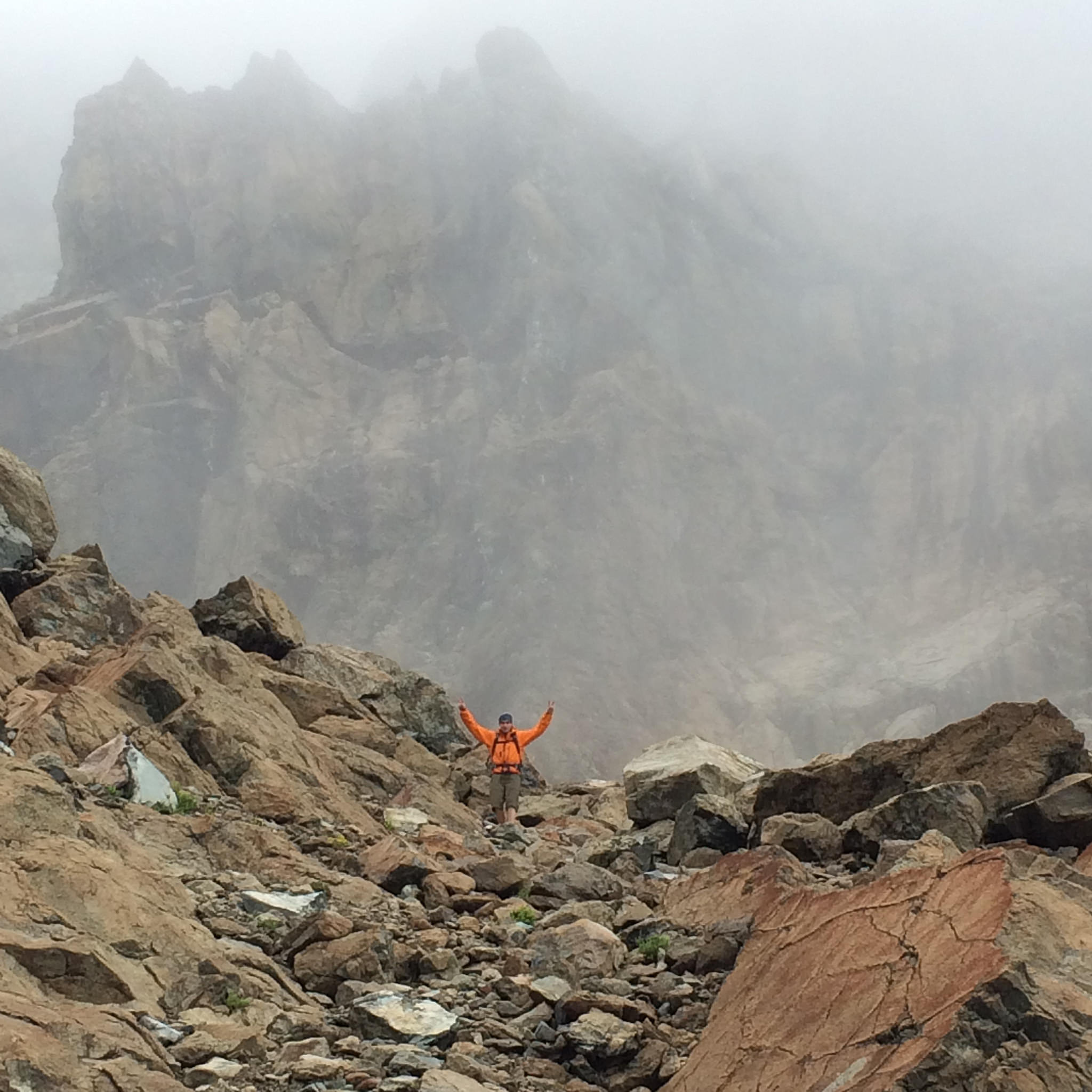 The approach follows the very pleasant trail towards Long’s Pass before heading West, up and over Ingalls Pass. None of us had been to Lake Ingalls before so we were all excited about the new terrain. It sure felt like a beautiful place from the few glimpses we got, but we mostly were looking at clouds. In fact, the entire Ingalls group was masked in clouds, so we had one false start and headed up a boulder field towards the wrong notch on the ridgeline. We soon realized our mistake and had a mini adventure finding our way to the start of the climb.