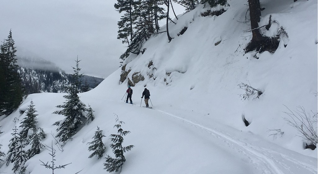 We started out at the Henry Creek approach on the east side of US 2. Making our way to FS road 687, skinning the logging road up the twisty switch backs to the clear cut. Arrowhead Mountain was hovering above us so we knew we where headed in the right direction. After the clear cut the tight trees get thick and the trail is steep. A slight skin track was broken before us and we where able to navigate through it while noting the map to reinsure confidence in our navigation. The open ski glades started to pop out as we where skinning through the tight treed forest making our way up toward the rocky clumping to the summit of Arrowhead Mountain.