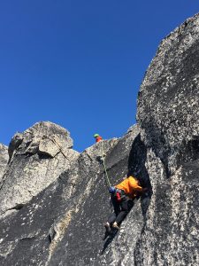 At the col we left our bags, and started scrambling to the base of the climb. We had planned on climbing the original route that heads directly up the north face of the spire. However we struggled significantly with route finding, and ultimately opted for what now seems to be the most popular route. This option traverses right at the top of pitch two. If I described the climb how we did it, it would be a messy and confusing string of climbing, rappelling, traversing, and so on. I will instead pitch it out how I would climb the North Face of Burgundy if I were to do it again.