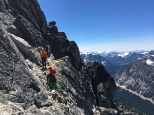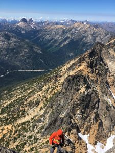 As we approached the base of Paisano around 8, it became clear that we would have to wait for a few other parties to climb before our two parties of two could jump on. Weighing our priorities for the day and recognizing that a delay may mean we couldn’t complete the link up, we decided to push on to Burgundy. We scrambled up to Burgundy Col at 7720’, roughly 3600’ above Early Winters Creek.