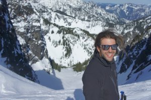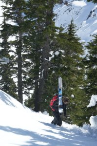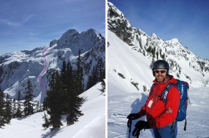 We settled on a loop in the Aplental backcountry with descents down a north aspect of Chair Peak and Holy Diver on the way out, and descents from Gem Lake and Snow Lake on the way back. For this route the larger more avalanche prone descents down Chair and Holy Diver are north facing and accomplished early in the day, before snow would be expected to be sliding around. The route’s descents down from Gem and Snow Lakes are south facing and skied in the heat of the afternoon, but the terrain here is smaller and more manageable. The ascents on this tour are favorable for a warm day as well – The south aspect ascents up Chair Peak and Mt. Roosevelt are accomplished early in the day, leaving shaded north facing ascents to Gem Lake and Snow Lake Divide for the afternoon.