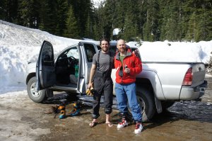 We hit the trail at 7:30 AM, just between dawn and sunrise. Conditions for the tour up were hard pack, as to be expected with Sunday’s warm weather and refreezing overnight. Travel got a little friendlier as the sun began to warm the snow/ice surface while ascending Snow Lake divide.