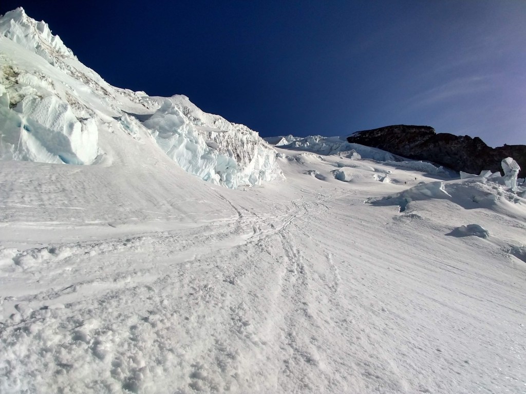 At the top of the finger we went high and left above a serac before hooking right onto the Upper Nisqually Glacier.