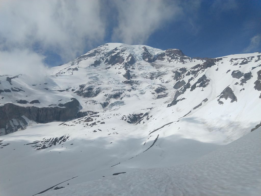 The weather for our ascent was warm and sunny. Just before dropping down to the Lower Nisqually Glacier, we got a nice view of our planned route. We chose to hook low and left around the Wilson glacier and gain the ridge to camp, rather than picking our way up through the middle as some do.