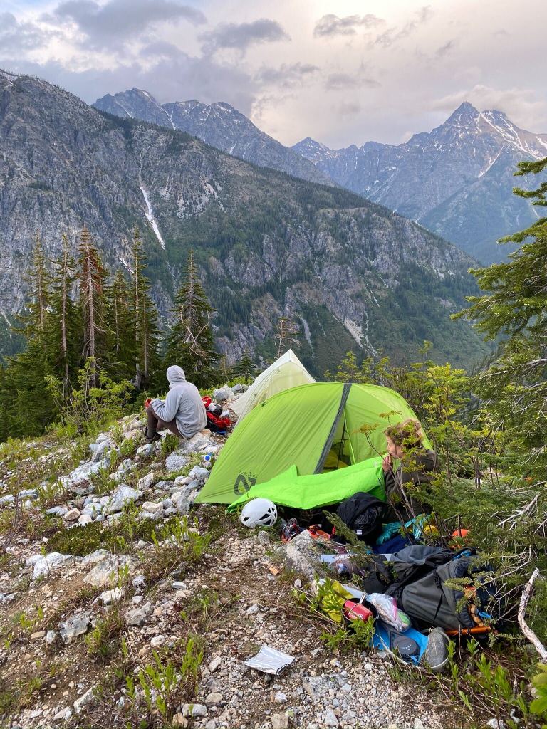 The terrain is steep below the glacier and once you leave the creek down low you can count the number of level spots suitable for even a small tent on a couple fingers. We found one at 5200ft and squeezed two tents on to it comfortably, finally dropping our bags for the day at 7:45pm.