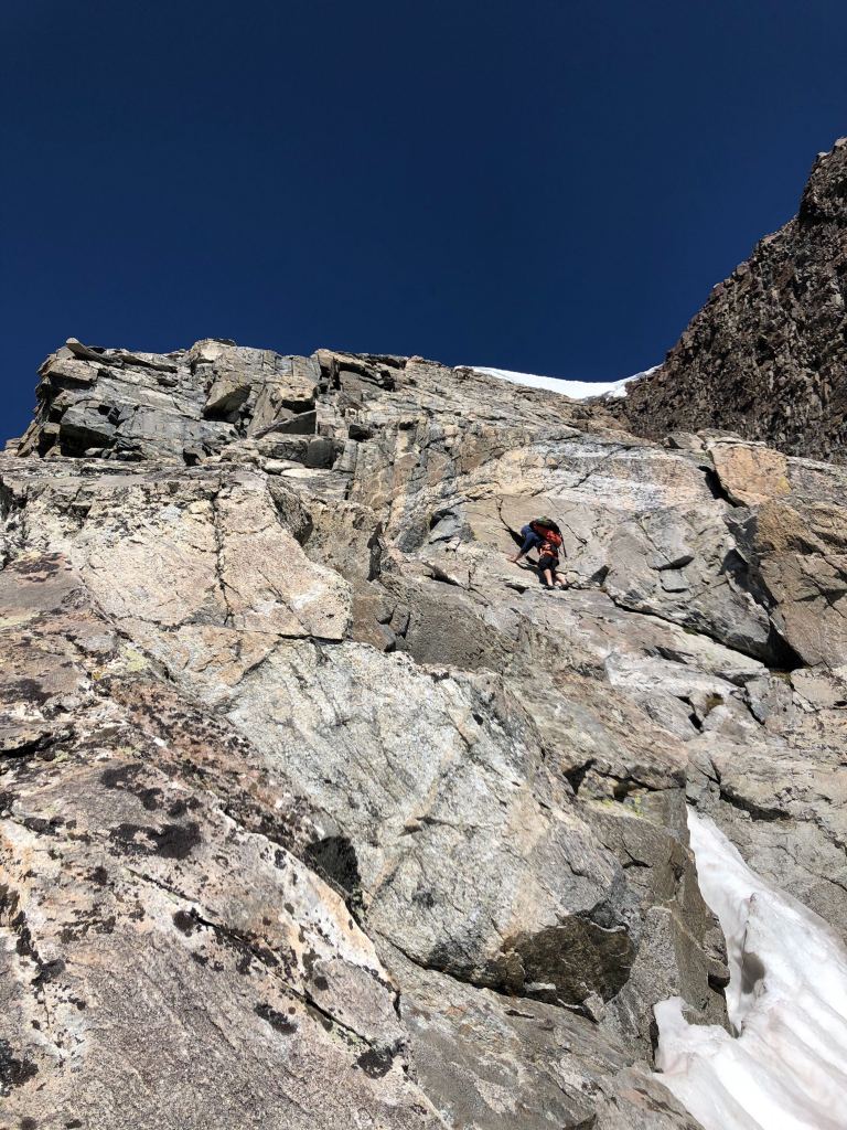 The climb itself starts immediately at the base of the rappels. We simul-climbed the route in 3.5 blocks starting by moving right traversing slightly away from Unsoeld’s Needle and then moving straight up though a weakness in the rock. The face can be climbed virtually any way you choose staying left of the Black Dike, we found our way up closer to the dike itself. We never found the climbing to be more difficult than 5.2-5.3 with plenty of 4th class.
